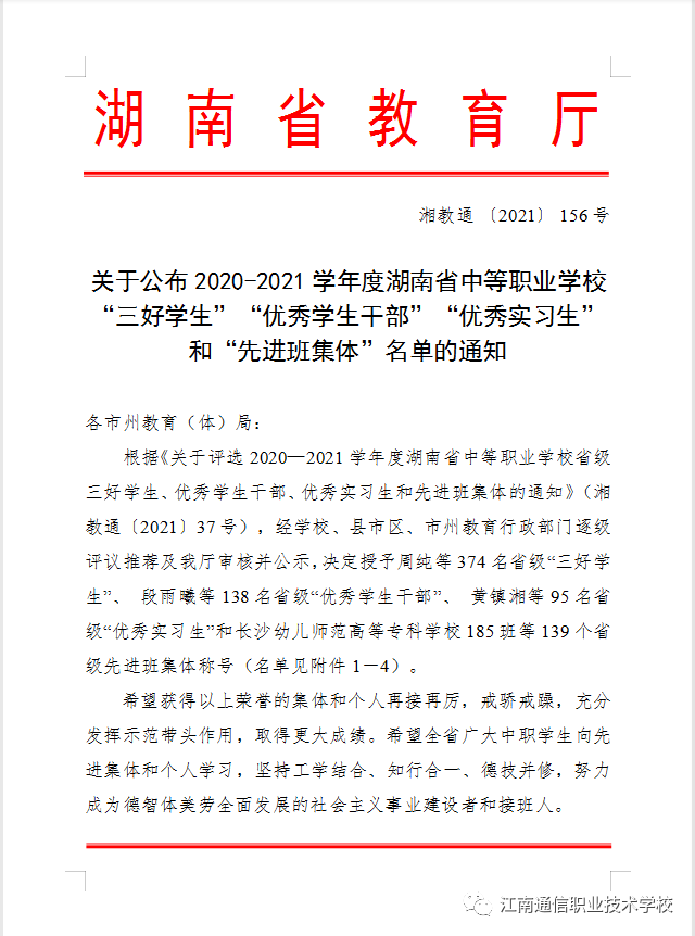 經(jīng)學校評議、推薦,岳陽市教育局、湖南省教育廳審核評定2020-2021學年度湖南省中等職業(yè)學?!笆〖壢脤W生、優(yōu)秀學生干部、優(yōu)秀實習生、先進班級體”評選結果新鮮出爐!